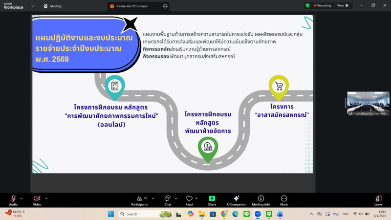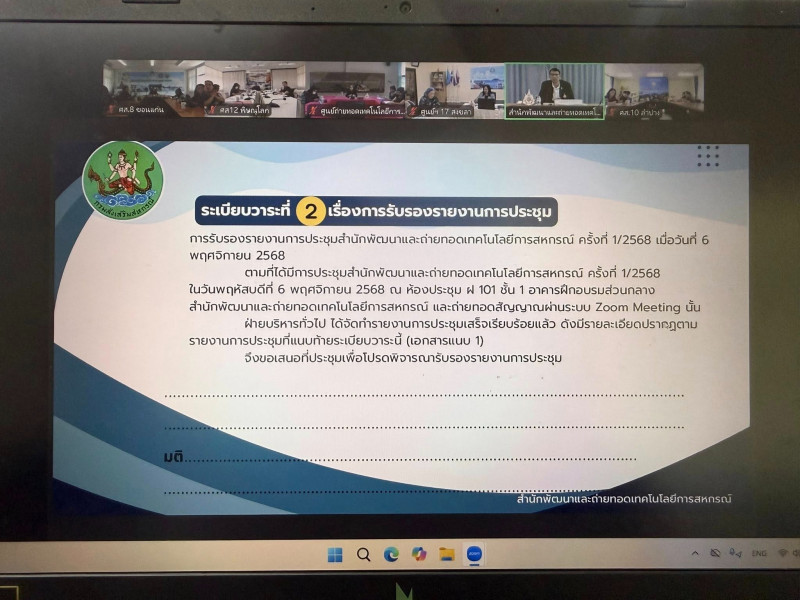 วันที่ 8 มกราคม 2569 บุคลากรศูนย์ถ่ายทอดเทคโนโลยีการสหกรณ์ที่ 8 จังหวัดขอนแก่น เข้าร่วมประชุมบุคลากรสำนักพัฒนาและถ่ายทอดเทคโนโลยีการสหกรณ์ ครั้งที่ 1/2569 โดยมีนายอนุรัตน์ เลื่อนลอย ผู้อำนวยการสำนักพัฒนาและถ่ายทอดเทคโนโลยีการสหกรณ์เป็นประธาน ถ่ายทอดสัญญาณผ่านระบบ Zoom Meeting ณ ห้องประชุม ฝ 10 1 อาคารฝึกอบรมส่วนกลาง สำนักพัฒนาและถ่ายทอดเทคโนโลยีการสหกรณ์ เขตดุสิต กรุงเทพมหานคร