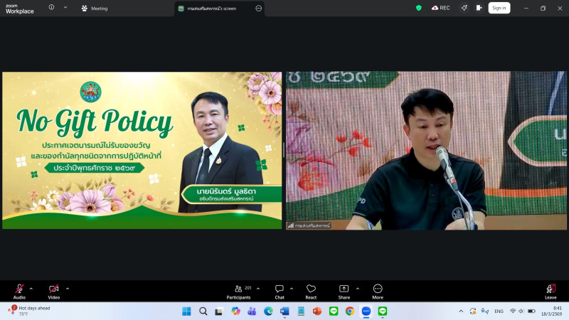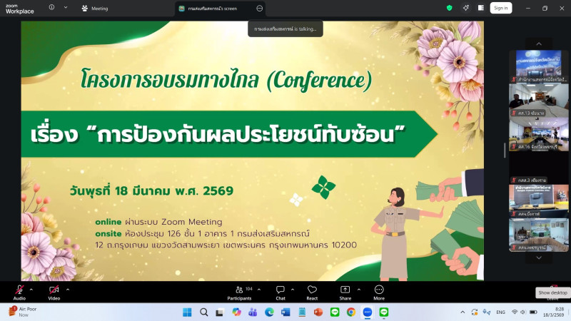 วันที่ 18 มีนาคม 2569 นางสาวมะยุรี คำภาศรี ผู้อำนวยการศูนย์ถ่ายทอดเทคโนโลยีการสหกรณ์ที่ 8 จังหวัดขอนแก่น พร้อมด้วยบุคลากร เข้าร่วมโครงการอบรมทางไกล (conference) “เรื่องการป้องกันผลประโยชน์ทับซ้อน” โดยได้รับเกียรติจาก นายนิรันดร์ มูลธิดา อธิบดีกรมส่งเสริมสหกรณ์ เป็นประธานในพิธีเปิดโครงการ วัตถุประสงค์เพื่อให้ความรู้ ความเข้าใจ และสร้างความตระหนักค่านิยม จิตสำนึก และเสริมสร้างจริยธรรมแก่ข้าราชการ ลูกจ้างประจำ และพนักงานราชการ ทั้งส่วนกลางและส่วนภูมิภาค ถ่ายทอดสัญญาณผ่านระบบ Zoom Meetings ณ ห้องประชุม 126 ชั้น 1 อาคาร 1 เทเวศร์ กรมส่งเสริมสหกรณ์ กรุงเทพมหานคร